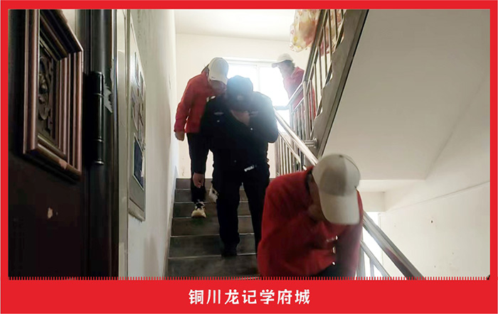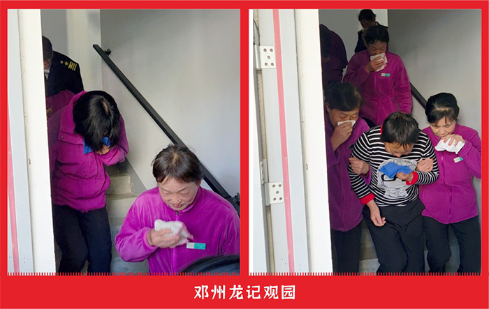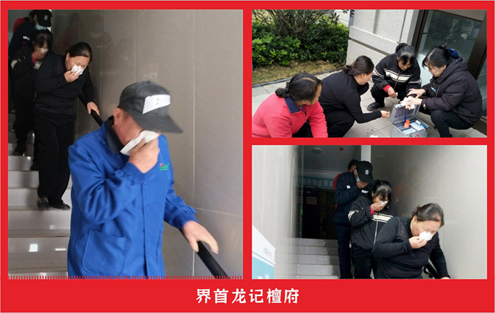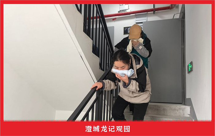 疏散组迅速到达各疏散点,对撤离人员进行引导。疏散过程中,大家拿毛巾捂住口鼻,有序撤离现场。